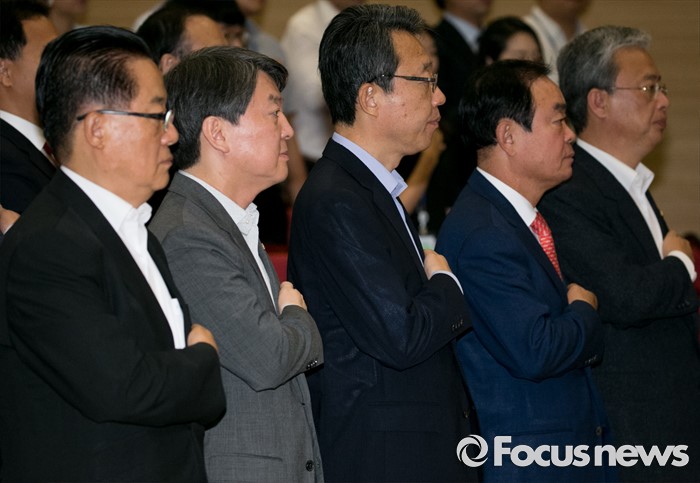 (서울=포커스뉴스) 5일 오전 서울 여의도 국회 의원회관에서 열린 국민의당 성희롱 예방교육에 참석한 박지원(앞줄 왼쪽부터) 비대위원장, 안철수 전 대표, 김성식 정책위의장, 장병완, 유성엽 의원 등이 국기에 대한 경례를 하고 있다.