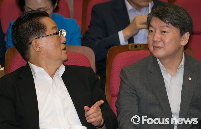 (서울=포커스뉴스) 5일 오전 서울 여의도 국회 의원회관에서 열린 국민의당 성희롱 예방교육에 참석한 안철수(오른쪽) 전 대표와 박지원 비대위원장이 대화하고 있다.