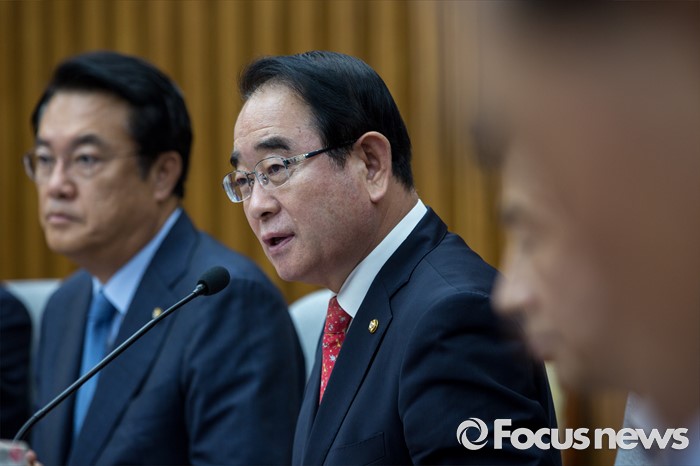 (서울=포커스뉴스) 박명재 새누리당 사무총장이 5일 오전 서울 여의도 국회에서 열린 원내대책회의에 참석해 모두발언 하고 있다.