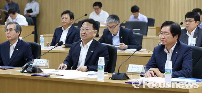 (세종=포커스뉴스) 유일호 경제부총리 겸 기획재정부장관이 5일 오전 서울-세종 영상회의로 열린 경제관계장관회의에 참석해 회의를 주재하고 있다.