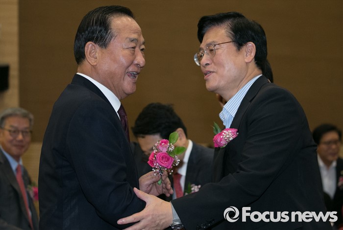 (서울=포커스뉴스) 5일 오전 서울 여의도 국회 의원회관에서 열린 미래성장 경제정책포럼 창립총회에 참석한 서청원(왼쪽), 정우택 새누리당 의원이 인사하고 있다.