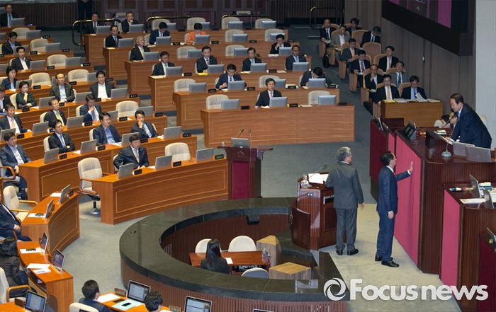 (서울=포커스뉴스) 5일 오전 서울 여의도 국회에서 열린 343회 국회(임시회) 7차 본회의, 정치·외교·통일·안보·교육·사회·문화에 관한 질문에 참석한 이장우 새누리당 의원 등과 김동철 국민의당 의원이 언쟁을 벌이자 김도읍 새누리당 원내수석부대표와 박주선 국회 부의장이 논의하고 있다.