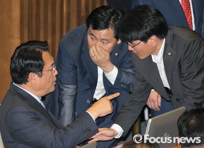 (서울=포커스뉴스) 5일 오전 서울 여의도 국회에서 열린 343회 국회(임시회) 7차 본회의, 정치·외교·통일·안보·교육·사회·문화에 관한 질문에 참석한 이장우 새누리당 의원 등과 김동철 국민의당 의원이 언쟁을 벌이자 정진석 새누리당 원내대표와 박완주 더불어민주당 원내수석부대표, 김관영 국민의당 원내수석부대표가 논의하고 있다.