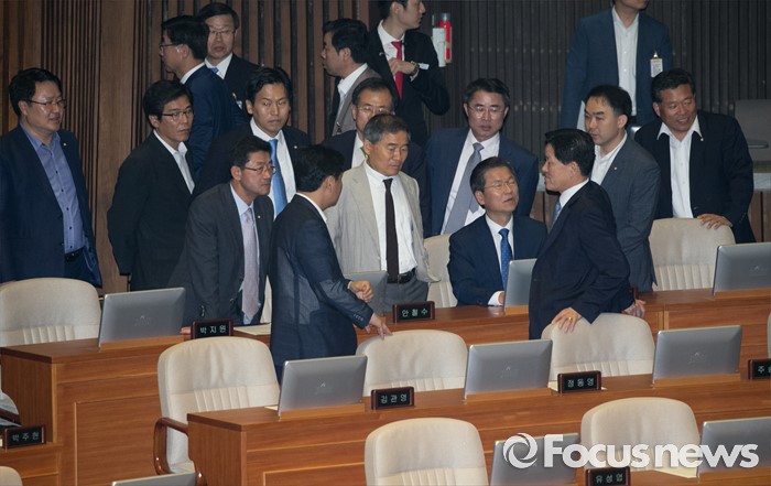 (서울=포커스뉴스) 5일 오전 서울 여의도 국회에서 343회 국회(임시회) 7차 본회의, 정치·외교·통일·안보·교육·사회·문화에 관한 질문이 이장우 새누리당 의원 등과 김동철 국민의당 의원의 언쟁으로 정회된 후 천정배 국민의당 전 대표 등 의원들이 논의하고 있다.