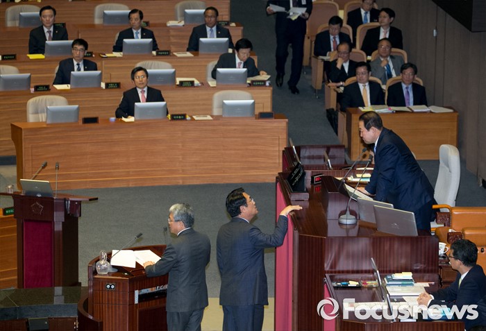 (서울=포커스뉴스) 5일 오전 서울 여의도 국회에서 열린 343회 국회(임시회) 7차 본회의, 정치·외교·통일·안보·교육·사회·문화에 관한 질문에 참석한 이장우 새누리당 의원 등과 김동철 국민의당 의원이 언쟁을 벌이자 정진석 새누리당 원내대표, 박주선 국회 부의장가 논의하고 있다.