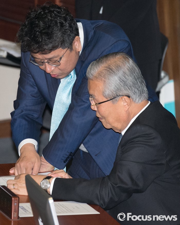 (서울=포커스뉴스) 5일 오전 서울 여의도 국회에서 열린 343회 국회(임시회) 7차 본회의, 정치·외교·통일·안보·교육·사회·문화에 관한 질문에 참석한 김종인(오른쪽) 더불어민주당 비대위 대표와 이철희 의원이 대화하고 있다.