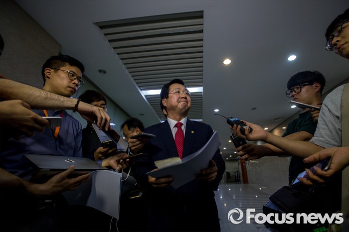 (서울=포커스뉴스) 이장우 새누리당 의원이 5일 오후 서울 여의도 국회에서 김동철 국민의당 의원과 본회의장에서의 언쟁을 벌인 것과 관련한 입장발표를 마친 뒤 취재진 질문에 답하고 있다.