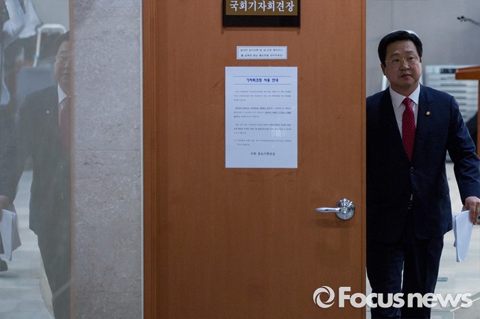 | △ 기자회견장 나서는 이장우 새누리당 의원 |