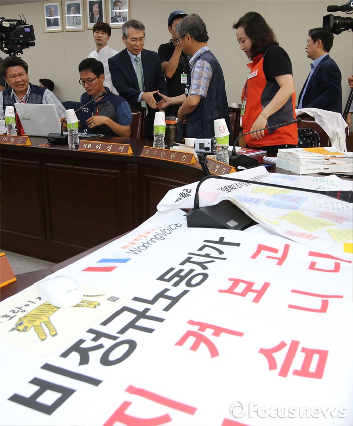 (세종=포커스뉴스) 5일 오후 세종시 정부세종청사 고용노동부 최저임금위원회에서 열린 제9차 전원회에서 박준성 위원장이 근로자위원들과 악수를 하는 중에 근로자위원 자리에 '비정규노동자가 지켜보고 있다'라는 문구가 보이고 있다.