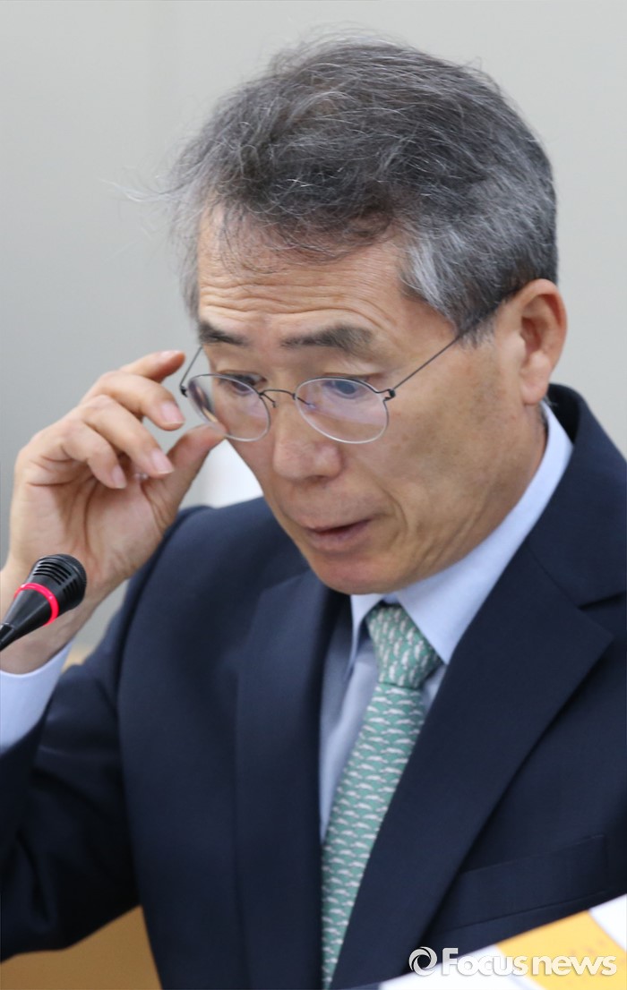 (세종=포커스뉴스) 5일 세종시 정부세종청사 고용노동부 최저임금위원회에서 열린 제9차 전원회에서 박준성 위원장이 회의중 안경을 만지고 있다.