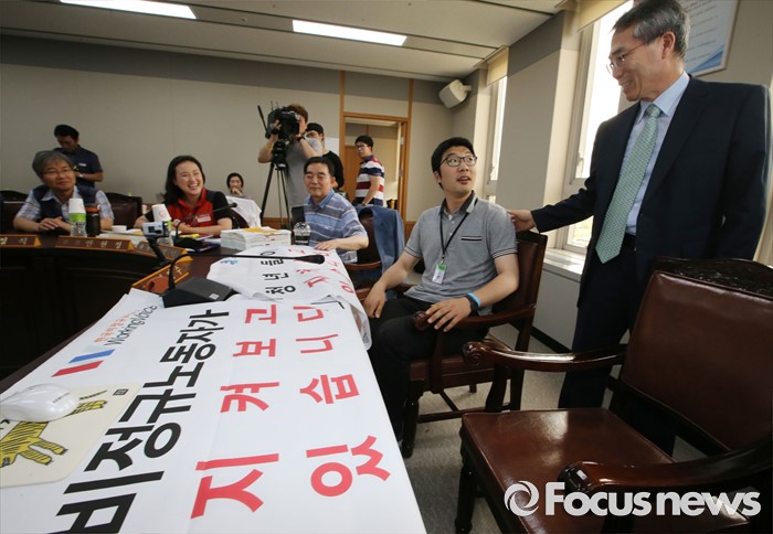 (세종=포커스뉴스) 5일 오후 세종시 정부세종청사 고용노동부 최저임금위원회에서 열린 제9차 전원회에서 박준성 위원장이 근로자위원 자리에 올려 놓은 '비정규노동자가 지켜보고 있다', '청년들이 지켜보고 있다'라고 적힌 현수막을 바라보고 있다.