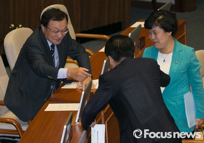 (서울=포커스뉴스) 5일 오후 서울 여의도 국회에서 열린 343회 국회(임시회) 7차 본회의, 정치·외교·통일·안보·교육·사회·문화에 관한 질문에 참석한 이해찬(왼쪽) 무소속 의원과 정동영(가운데), 조배숙 국민의당 의원이 인사하고 있다.