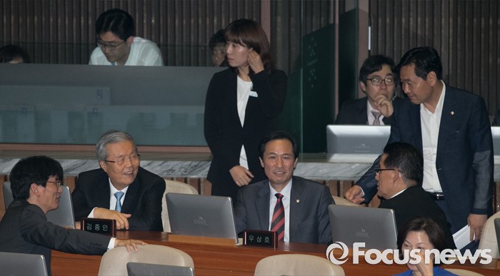 (서울=포커스뉴스) 5일 오후 서울 여의도 국회에서 열린 343회 국회(임시회) 7차 본회의, 정치·외교·통일·안보·교육·사회·문화에 관한 질문에 참석한 김종인 더불어민주당 비대위 대표, 우상호 원내대표와 박지원 국민의당 비대위원장, 김관영 원내수석부대표 등이 대화하고 있다.
