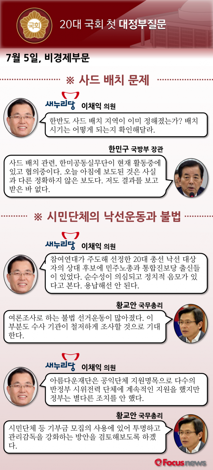 비경제부문 대정부 질문에 새누리당은 윤상현·박덕흠·이채익·오신환·성일종 의원, 더불어민주당에서는 박범계·심재권·표창원·한정애·이철희 의원, 국민의당에서는 김동철·이용주 의원, 정의당에서는 김종대 의원이 질의자로 나섰다.