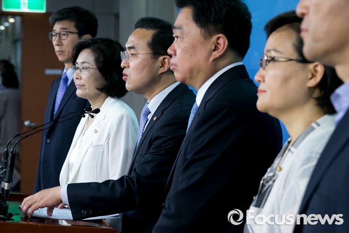 (서울=포커스뉴스) 6일 오전 서울 여의도 국회 정론관에서 미래창조과학방송통신위원회 소속 더불어민주당 의원들이 이정현 전 청와대 홍보수석과 김시곤 전 KBS 보도국장의 세월호 참사 보도통제 논란과 관련 새누리당과 박근혜 정부의 진상규명 협조 촉구 기자회견을 하고 있다.