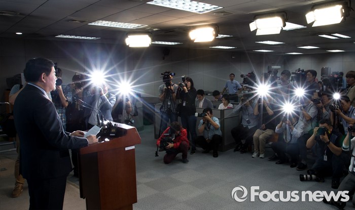 (서울=포커스뉴스) 최경환 새누리당 의원이 6일 오전 서울 여의도 국회에서 새누리당 당대표를 선출하는 전당대회 불출마 선언 하고 있다.