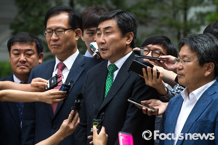 (서울=포커스뉴스) 2012년 대선을 앞두고 발생한 '국정원 여직원 감금 사건' 재판 선고가 내려진 6일 오전 서울 서초구 서울중앙지법 앞에서 이종걸 더불어민주당 의원이 재판 선고 후 법원 앞에서 취재진과 인터뷰를 하고 있다.