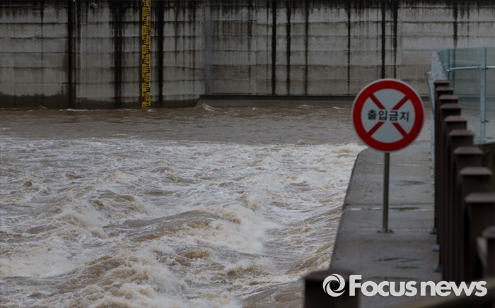 (연천=포커스뉴스) 북한이 황강댐을 방류한 6일 오전 경기도 연천군 군남홍수조절지에서 한국수자원공사가 수위조절을 위해 임진강 강물을 방류하고 있다.