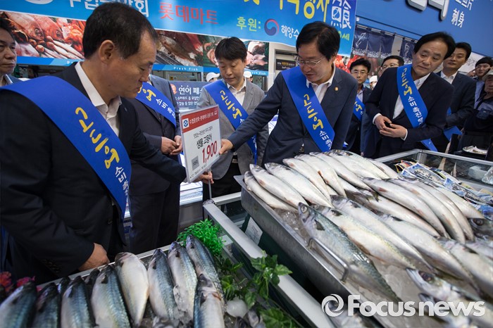 (서울=포커스뉴스) 김영석 해양수산부 장관을 비롯한 수협 관계자 들이 6일 오전 서울 용산구 롯데마트 서울역점을 방문해 최근 미세먼지 논란으로 소비가 위축된 고등어 소비 활성화를 위해 판촉 및 시식 행사에 참여하고 있다. 지난 5월 '고등어를 구울 때 미세먼지가 발생한다'는 환경부의 발표이후 소비둔화로 이어져, 고등어를 찾는 사람이 급격히 줄었다.