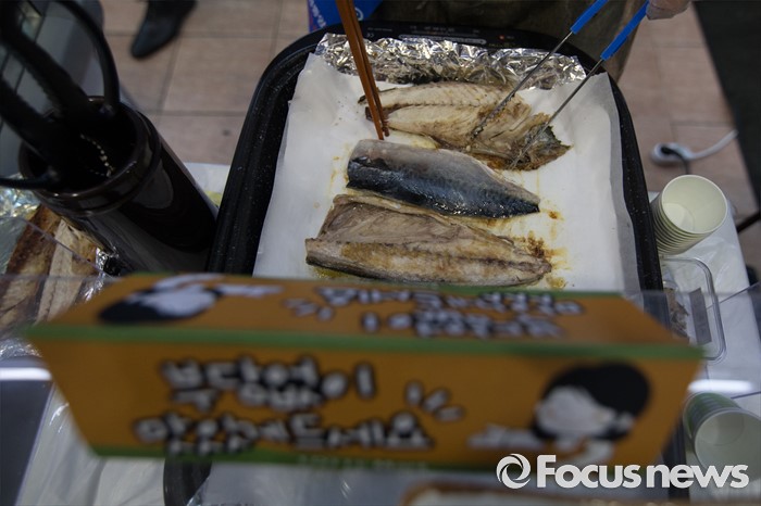 (서울=포커스뉴스) 6일 오전 서울 용산구 롯데마트 서울역점에서 최근 미세먼지 논란으로 소비가 위축된 고등어 소비 활성화를 위해 판촉 및 시식 행사가 열리고 있다. 지난 5월 '고등어를 구울 때 미세먼지가 발생한다'는 환경부의 발표이후 소비둔화로 이어져 고등어를 찾는 사람이 급격히 줄었다.