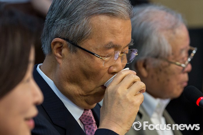 (서울=포커스뉴스) 김종인 더불어민주당 비상대책위 대표가 6일 오전 서울 여의도 국회의원회관에서 열린 '따뜻한 미래를 위한 정치기획 창립기념 특강'에 참석해 물을 마시고 있다.