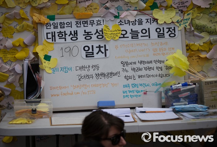 (서울=포커스뉴스) 6일 오후 서울 종로구 주한일본대사관 앞에서 일본군 '위안부' 문제 해결을 위한 제1238차 정기 수요집회가 열리고 있다. 집회 뒷자리에 '한일합의 전면무효 대학생 농성 190일차'라는 글씨가 화이트보드에 적혀 있다.