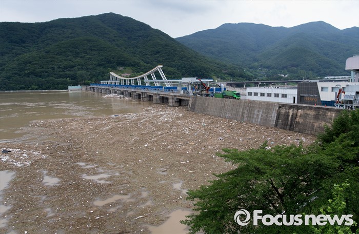 (남양주=포커스뉴스) 서울과 수도권 지역의 장마전선이 소강상태를 보이고 있는 6일 오전 경기도 남양주 팔당댐에 많은 부유물들이 떠내려와 있다.