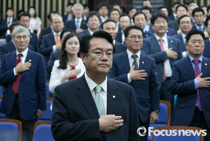 (서울=포커스뉴스) 6일 오후 서울 여의도 국회에서 열린 새누리당 의원총회에 참석한 정진석 원내대표와 의원들이 국기에 대한 경례를 하고 있다.