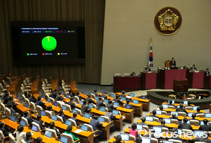 (서울=포커스뉴스) 6일 오후 서울 여의도 국회에서 열린 343회 국회(임시회) 8차 본회의에서 평창동계올림픽 및 국제경기대회지원 특별위원회 구성결의안이 재석 276인 중 찬성 262인, 반대 2인, 기권 12인으로 통과되고 있다.