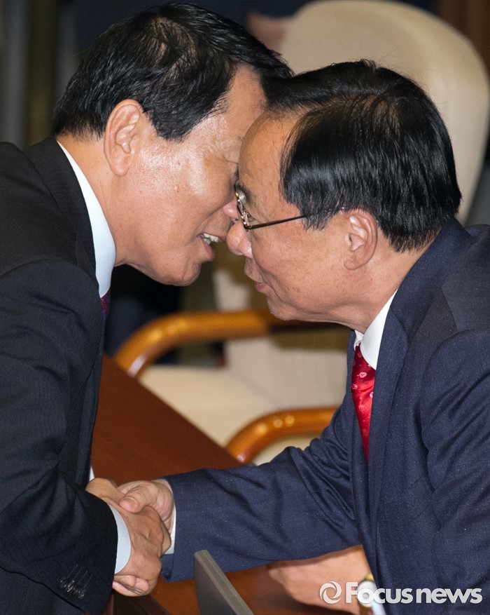 (서울=포커스뉴스) 6일 오후 서울 여의도 국회에서 열린 343회 국회(임시회) 8차 본회의에 참석한 이주영(오른쪽), 안상수 새누리당 의원이 대화하고 있다.