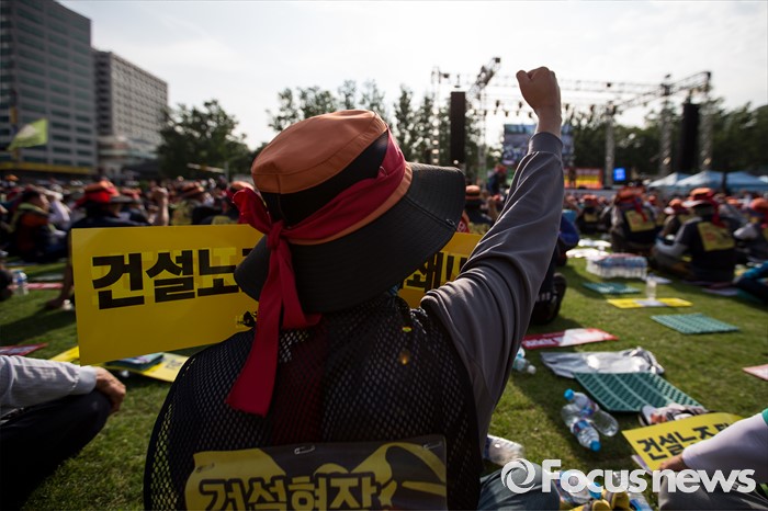 (서울=포커스뉴스) 6일 오후 서울 중구 서울시청광장에서 열린 '건설노동자 총력투쟁 결의대회'에 참석한 조합원들이 안전한 건설현장을 촉구하며 구호를 외치고 있다.