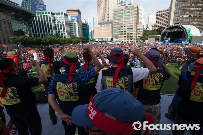 (서울=포커스뉴스) 6일 오후 서울 중구 서울시청광장에서 열린 '건설노동자 총력투쟁 결의대회'에 참석한 조합원들이 안전한 건설현장을 촉구하며 구호를 외치고 있다.