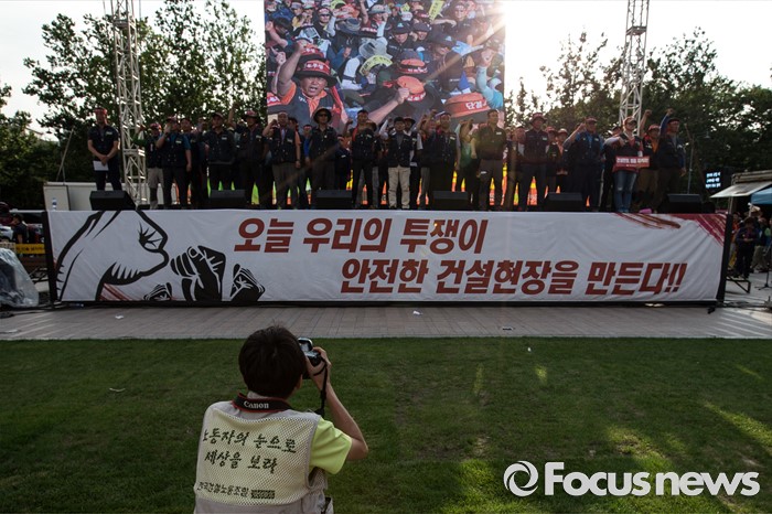 (서울=포커스뉴스) 6일 오후 서울 중구 서울시청광장에서 열린 '건설노동자 총력투쟁 결의대회'에 참석한 조합원들이 안전한 건설현장을 촉구하며 구호를 외치고 있다.