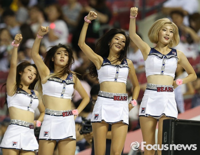 (서울=포커스뉴스) 6일 서울 잠실구장에서 열린 2016 프로야구 넥센-두산 경기에서 두산 치어리더가 비온 후의 선선한 여름밤에 열기를 더 하고 있다.