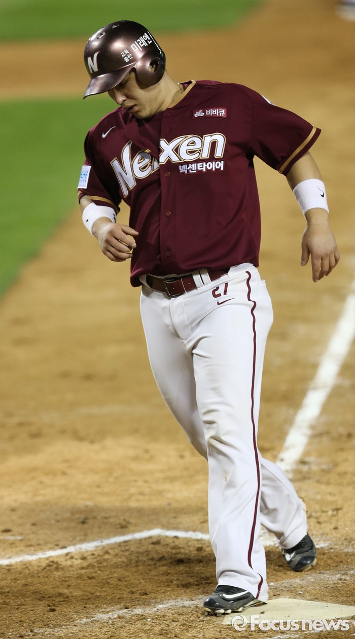(서울=포커스뉴스) 6일 서울 잠실구장에서 열린 2016 프로야구 넥센-두산 경기 9회초 2사 만루에서 넥센 3루주자 박동원이 윤석민의 밀어내기 볼넷으로 득점하고 있다.