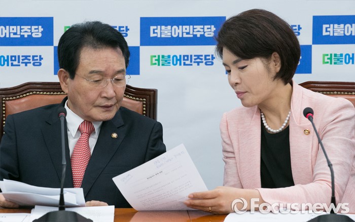 (서울=포커스뉴스) 7일 오전 서울 여의도 국회에서 열린 더불어민주당 정책조정회의에 참석한 변재일(왼쪽) 정책위의장과 한정애 정책위수석부의장이 대화하고 있다.
