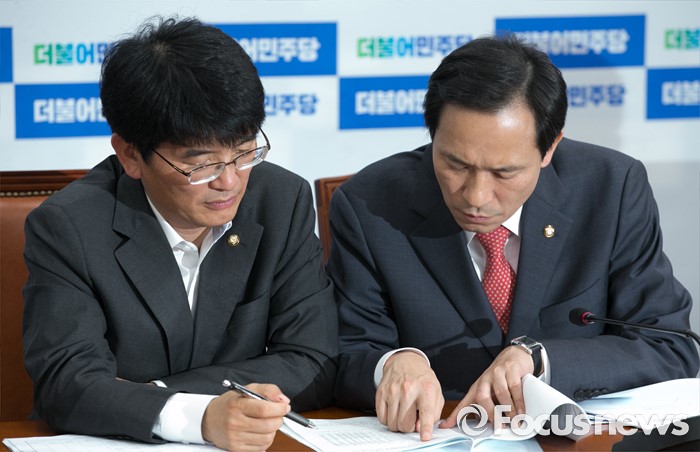 (서울=포커스뉴스) 7일 오전 서울 여의도 국회에서 열린 더불어민주당 정책조정회의에 참석한 우상호(오른쪽) 원내대표와 박완주 원내수석부대표가 대화하고 있다.