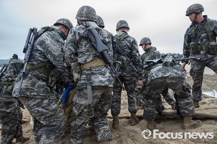 (태안=포커스뉴스) 7일 오전 충청남도 태안군 안면읍 인근 해안에서 2016 합동 해안양륙군수지원(J LOTS) 훈련이 열리고 있다. 합동참모본부 주관으로 해군과 해병대, 육군, 해경이 참가하는 합동 해안양륙군수지원 훈련은 항만 사용이 불가한 지역에서 작전을 수행중인 전투부대에 군수지운을 하기 위한 작전이다.