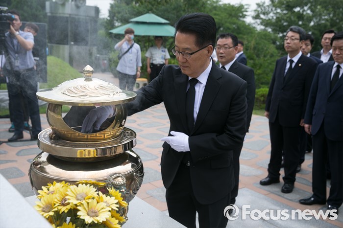 | △ DJ 묘소 참배하는 박지원 |