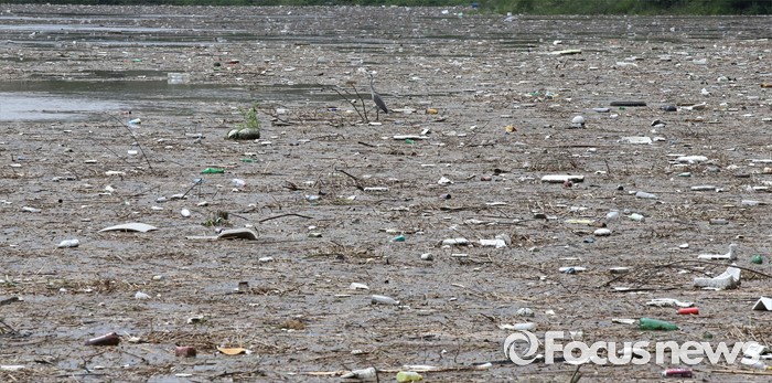 (옥천=포커스뉴스) 중부지방에 내린 집중호우로 7일 오전 충북 옥천군 군북면 대청호일대에 뒤덮힌 쓰레기 사이에서 외가리 한 마리가 먹이를 찾고 있다.