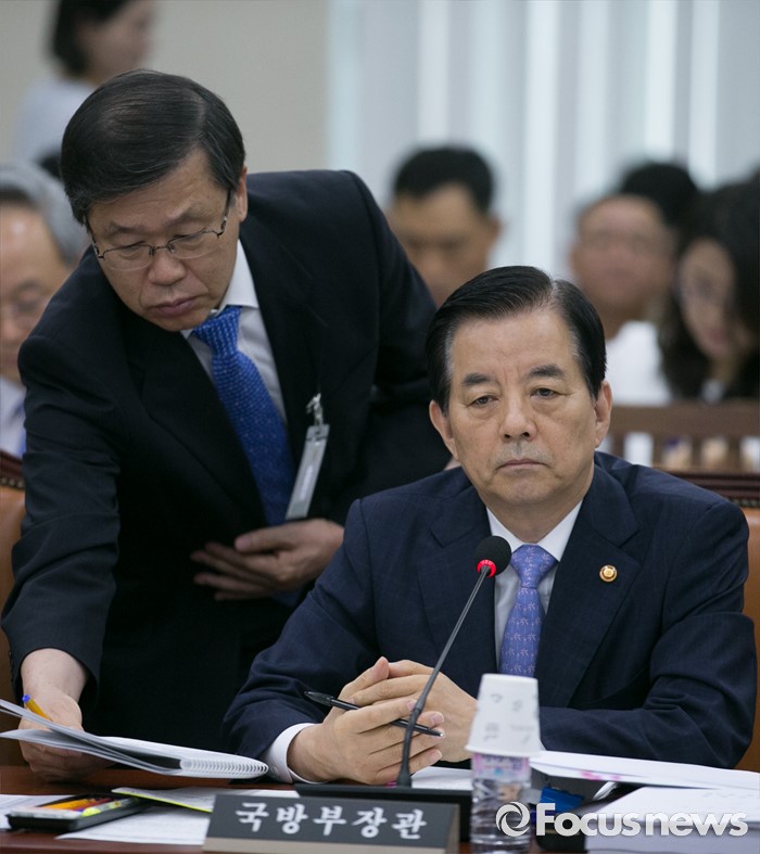 (서울=포커스뉴스) 7일 오전 서울 여의도 국회에서 열린 국방위원회 전체회의에 참석한 한민구(오른쪽) 국방부 장관이 황희종 기획조정실장으로부터 자료를 받고 있다.