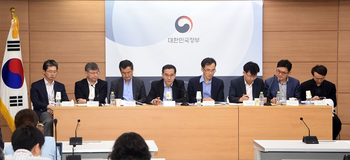 (서울=포커스뉴스) 유일호 부총리 겸 기획재정부 장관이 7일 서울 종로구 정부서울청사에서 '제10차 무역투자진흥회의' 결과 관계부처 합동브리핑에서 모두발언을 하고 있다. 왼쪽부터 강호인 국토부 장관, 정진엽 복지부 장관, 최양희 미래부 장관, 유일호 부총리, 주형환 산업부 장관, 이동필 농식품부 장관, 손문기 식약처장. <사진제공=기획재정부>
