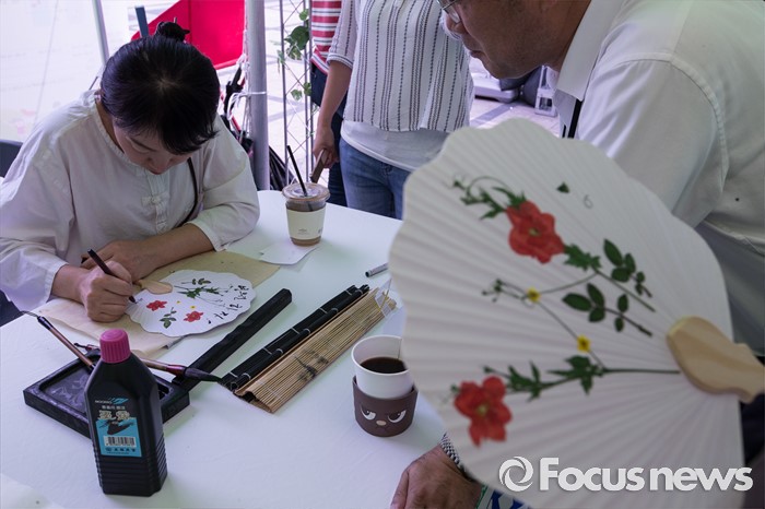 (서울=포커스뉴스) 7일 오후 서울 종로구 청계천 광장에서 열린 '2016 도시 농촌 교류의 날 및 농촌여름휴가 캠페인'에 참석한 시민들이 전통 부채 만들기 체험을 하고 있다.