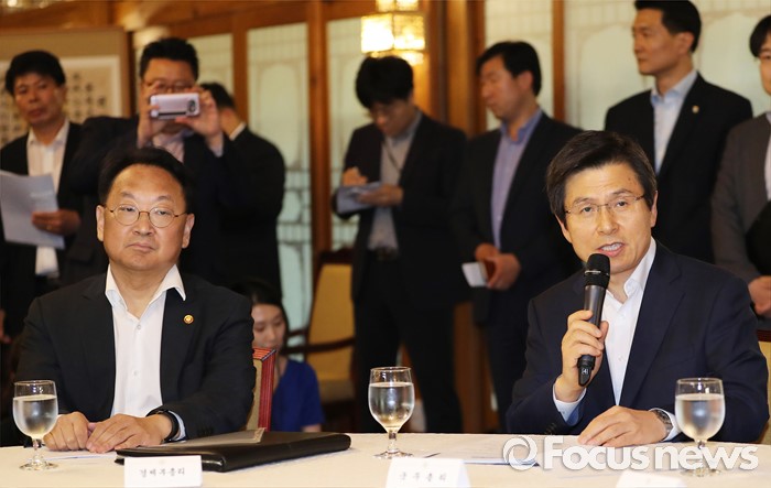 (서울=포커스뉴스) 7일 오후 서울 종로구 삼청동 국무총리공관에서 열린 당·정·청 정책조정협의회에서 황교안(오른쪽) 국무총리가 모두발언을 하고 있다. 왼쪽은 유일호 경제부총리 겸 기획재정부 장관.