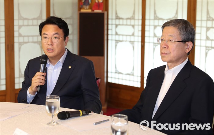 (서울=포커스뉴스) 7일 오후 서울 종로구 삼청동 국무총리공관에서 열린 당·정·청 정책조정협의회에서 정직석(왼쪽) 새누리당 원내대표가 모두발언을 하고 있다. 오른쪽은 김희옥 새누리당 혁신비상대책위원장.