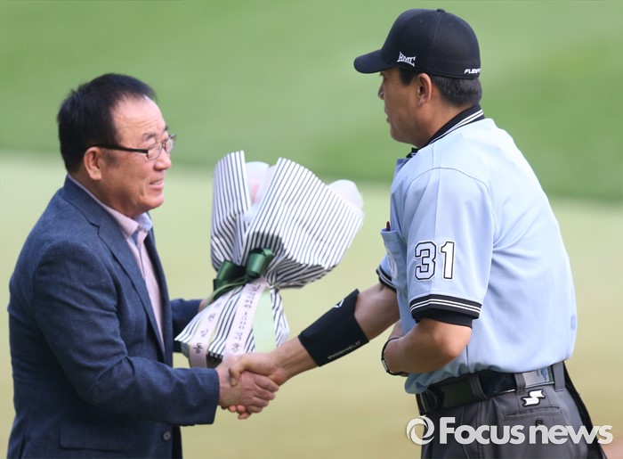 (서울=포커스뉴스) 6일 서울 잠실구장에서 열린 2016 프로야구 넥센-두산 경기에 앞서 이민호 심판의 1500경기 출장 기념 시상식을 갖고 도상훈 심판위원장이 꽃다발을 전달하고 있다.
