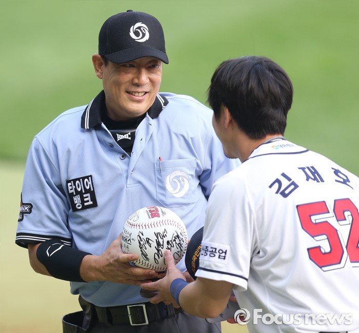 (서울=포커스뉴스) 6일 서울 잠실구장에서 열린 2016 프로야구 넥센-두산 경기에 앞서 이민호 심판의 1500경기 출장 기념 시상식을 갖고 김재호 두산 베어스 주장이 선수들의 사인이 담긴 대형 사인볼을 전달하고 있다.
