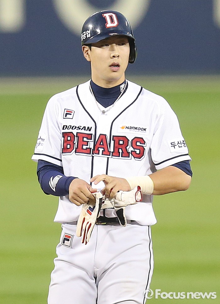 (서울=포커스뉴스) 6일 서울 잠실구장에서 열린 2016 프로야구 넥센-두산 경기 5회말 2사 2루에서 두산 박건우가 우익 선상에 떨어지는 2루타로 주자를 불러 들이고 2루에서 장갑을 벗고 있다.