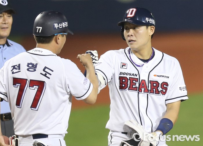 (서울=포커스뉴스) 6일 서울 잠실구장에서 열린 2016 프로야구 넥센-두산 경기 7회말 두산 선두타자 박세혁이 우익수 오른쪽으로 떨어지는 3루타를 치고 3루에서 전형도 코치의 환영을 받고 있다.