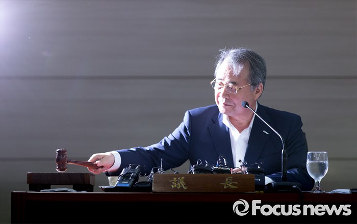 (서울=포커스뉴스) 8일 오전 서울 송파구 올림픽파크텔에서 열린 대한체육회 제4차 긴급 임시 이사회에서 강영중 대한체육회 회장이 의사봉을 두드리고 있다. 이번 임시 이사회에서는 박태환의 리우 올림픽 출전 여부가 긴급 안건으로 상정됐다.